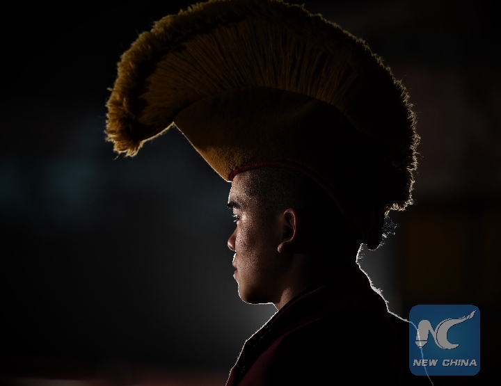 A monk is seen during the butter lamps lighting event at the Jokhang Temple in Lhasa, capital of southwest China's Tibet Autonomous Region, Dec. 2, 2018. (Xinhua/Purbu Zhaxi)