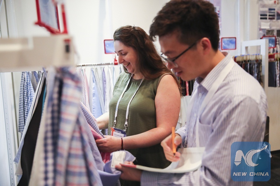 An American buyer looks at exhibits of a Chinese fabric producer at the Chinese Textile and Apparel Trade Show in New York, the United States, July 23, 2018. The 19th China Textile and Apparel Trade Show, an initiative to help Chinese textile and apparel makers and factories explore the U.S.market, has exhibitors from 17 countries and regions. (Xinhua/Wang Ying)