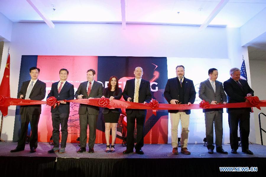 Guests attend a ribbon-cutting ceremony at the newly-opened R&D center of Guangzhou Automobile Group (GAC) in Detroit, the United States, Jan. 15, 2019. Guangzhou Automobile Group (GAC) unveiled a research and development center in Detroit, the U.S. state of Michigan. (Xinhua/Xu Yuan)