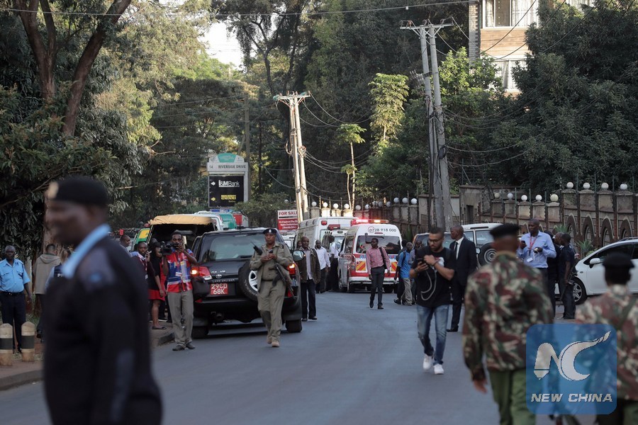 Security forces gather near the site of an attack at an upmarket hotel and office complex in Nairobi, Kenya, on Jan. 15, 2019. (Xinhua/Lyu Shuai)