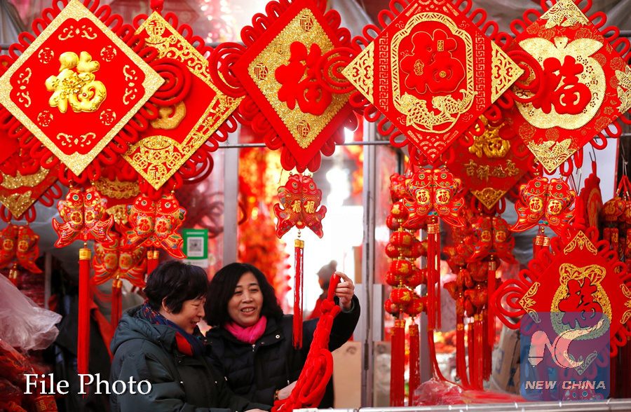 Consumers select New Year decorations at a market in Jimo District of Qingdao, east China's Shandong Province, Jan. 8, 2019. (Xinhua/Liang Xiaopeng)
