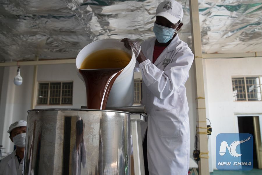 File photo shows a worker at Mpund Wild Honey, a Chinese-run firm, pours the honey during the production process in central Zambia's Kabwe town, on Nov. 3, 2018. (Xinhua/Peng Lijun)
