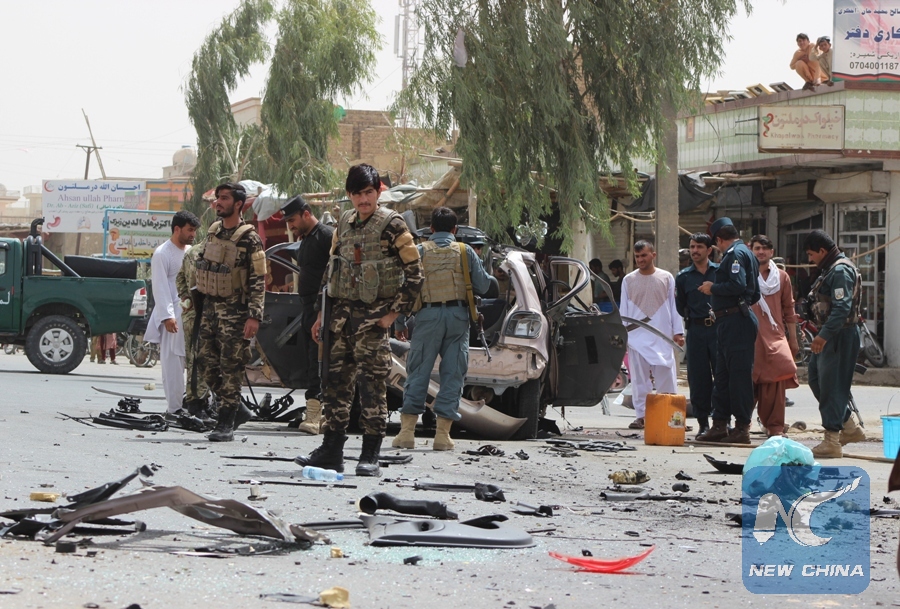 Afghan security force members inspect at the site of an attack in Lashkar Gah, capital of Helmand province, Afghanistan, Sept. 13, 2018. (Xinhua/Abdul Aziz Safdari)