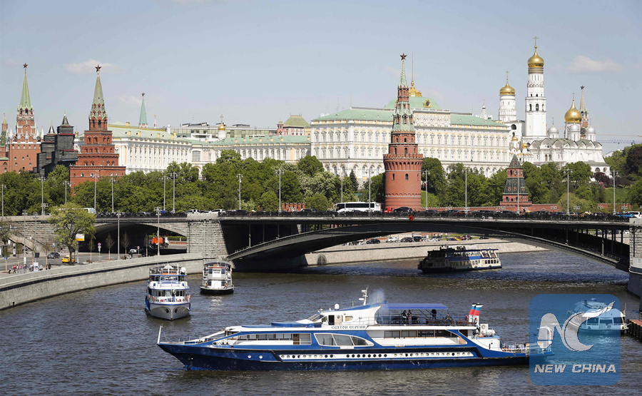 River buses sail past on the Moskva river, near the Kremlin (background) in Moscow on May 12, 2018, the first day in which river buses begin their summer navigation of the river. (AFP PHOTO)