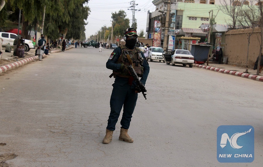 An Afghan policeman stands guard after a lawmaker was killed in Kandahar city, capital of Kandahar province, Afghanistan, March 23, 2019. (Xinhua/Sanaullah Seiam)