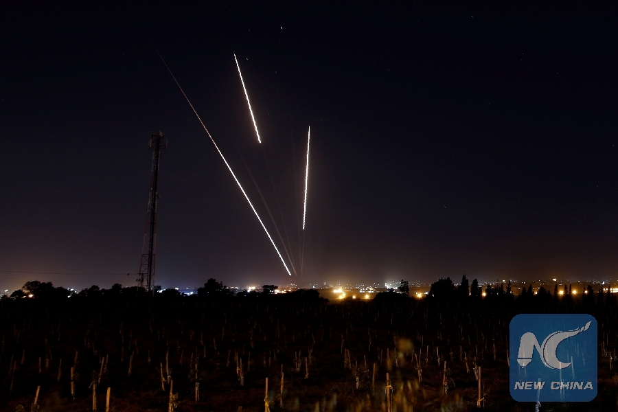 GAZA, March 25 (Xinhua) -- The militant groups in Gaza fired on Monday night a barrage of rockets into southern Israel after the intensive Israeli airstrikes on military facilities and compounds in the enclave.