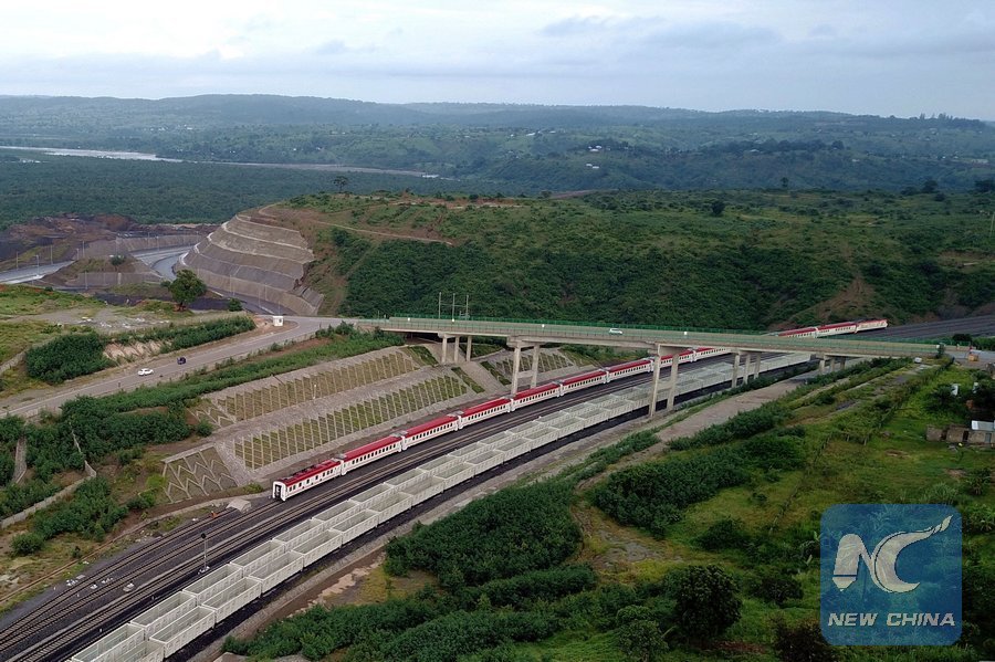 Aerial photo taken on June 2, 2018 shows a train running on the Chinese-built Mombasa-Nairobi Standard Gauge Railway in Kenya. (Xinhua/Wang Teng)