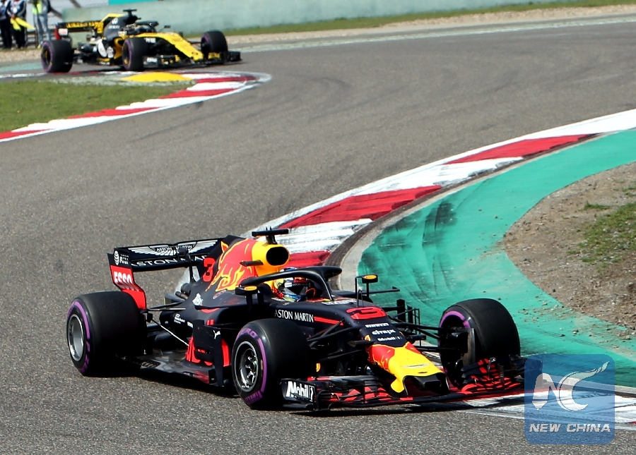Red Bull's driver Daniel Ricciardo of Australia competes during the Formula One Chinese Grand Prix in Shanghai on April 15, 2018. (Xinhua/Fan Jun)
