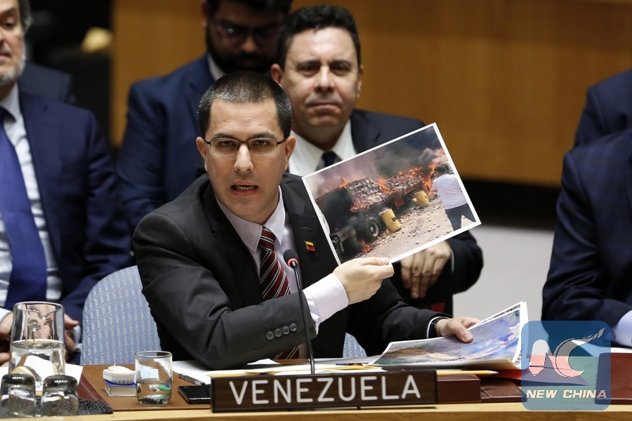 Venezuelan Foreign Minister Jorge Arreaza addresses a meeting of the United Nations Security Council on the situation in Venezuela at the UN headquarters in New York Feb. 26, 2019. (Xinhua/Li Muzi)