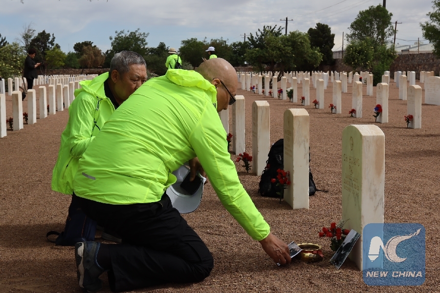 Family members of a killed Chinese pilot pay homage to their loved one in the Fort Bliss National Cemetery in El Paso, the United States, May 12, 2019.(Xinhua/Liu Liwei)