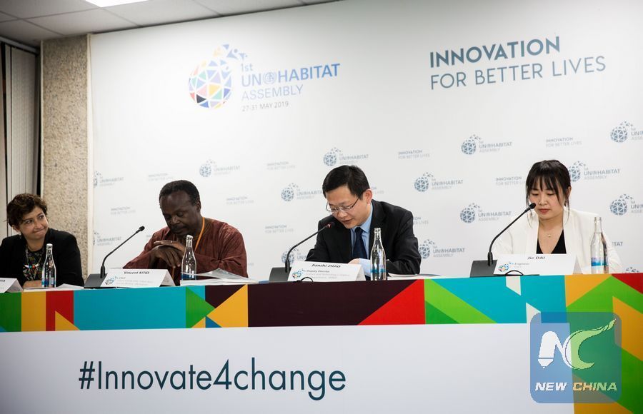 Photo taken on May 27, 2019 shows a book launch event at the first session of the UN-Habitat Assembly that is held on May 27-31 in Nairobi, Kenya. The event was for the launch of a book titled Net Zero Carbon Village Planning Guidelines for the Yangtze River Delta Region in China. (Xinhua/Lyu Shuai)