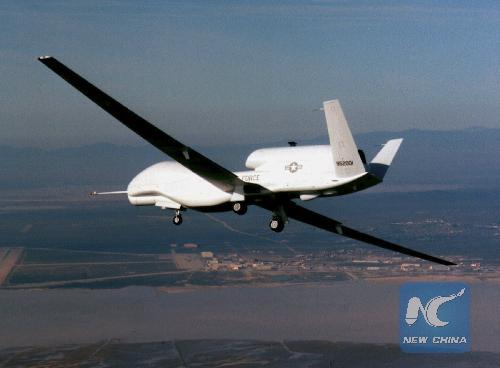 The Global Hawk drone, built by Northrop Grumman Corp for the U.S. Air Force, flies over Edwards Air Force Base on Feb. 28, 1998. (Reuters File photo)