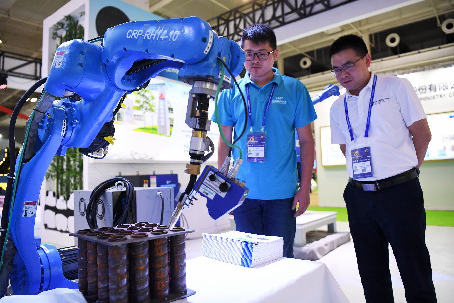 Visitors watch welding robot at the 25th China Lanzhou Investment and Trade Fair in northwest China's Gansu Province on July 4, 2019. (Xinhua/Chenbin)