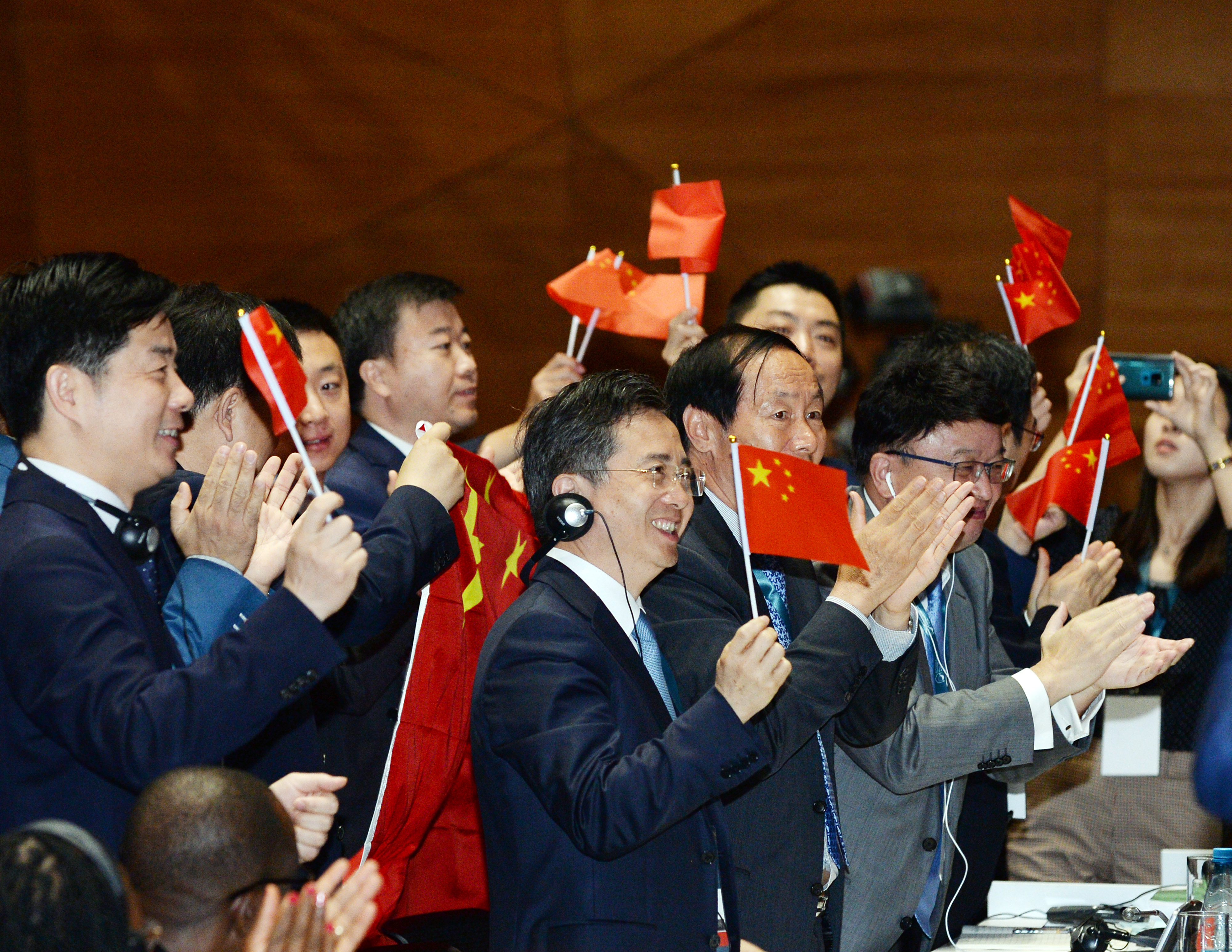 Members of the Chinese delegation celebrate the inscription of China's Archaeological Ruins of Liangzhu City on the World Heritage List during the 43rd session of the UNESCO World Heritage Committee in Baku, Azerbaijan, July 6, 2019. (Xinhua/Tofik Babayev)