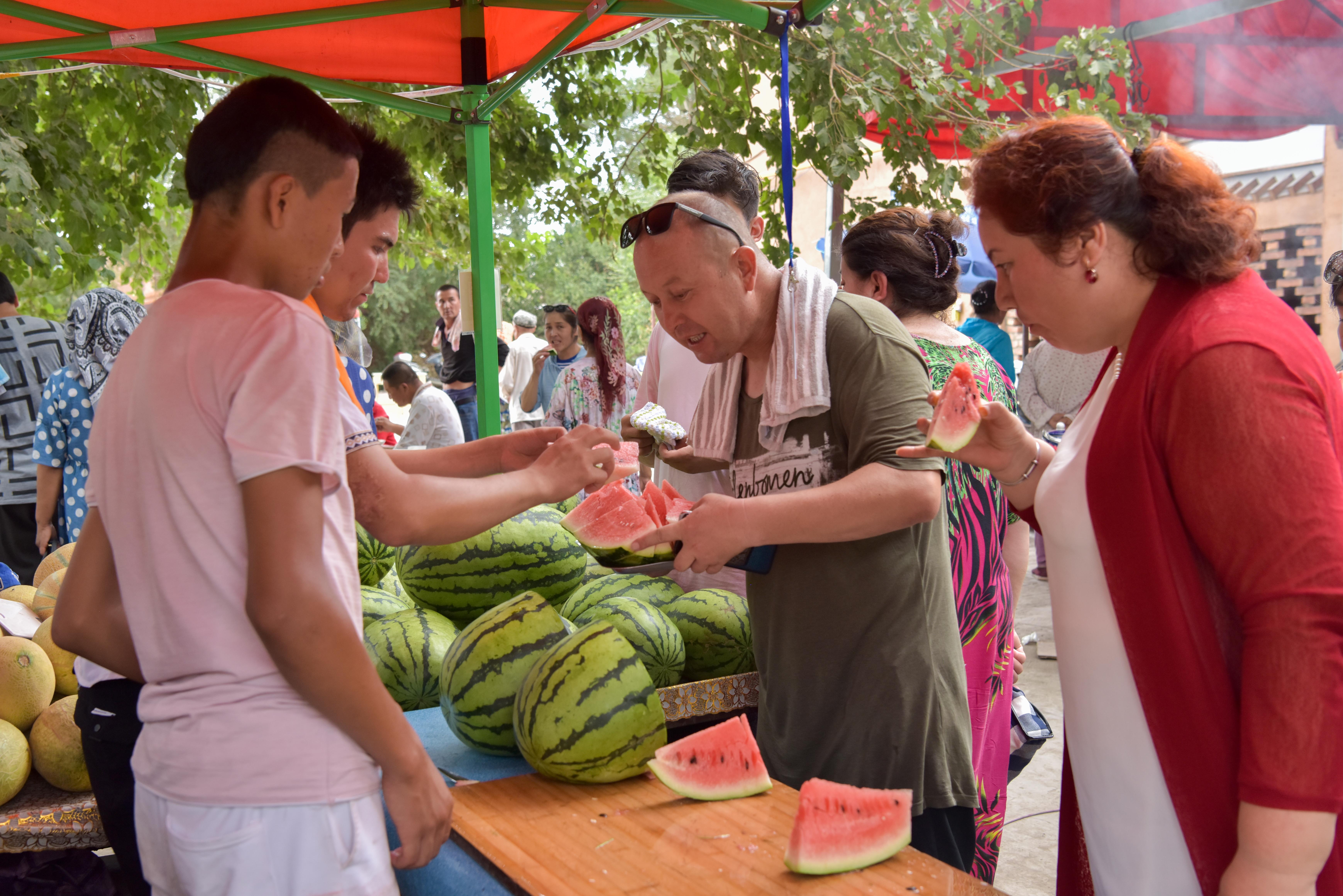 Tourists eat watermelon at the "Sand Therapy Town" in Turpan. (Xinhua/Ding Lei)