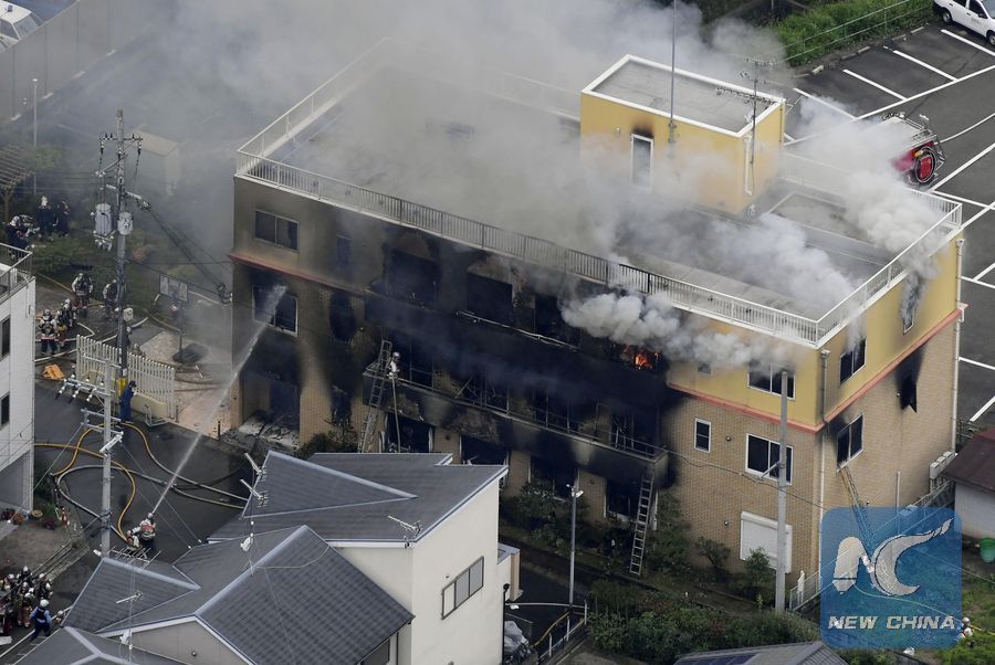 Firefighters extinguish a fire at an animation studio in Kyoto, Japan, July 18, 2019. The death toll of an anime studio blaze in Kyoto on Thursday has risen to 33, with 36 others injured, some suffering from severe burns or bleeding, local police and rescuers said. (Kyodo News via Xinhua)