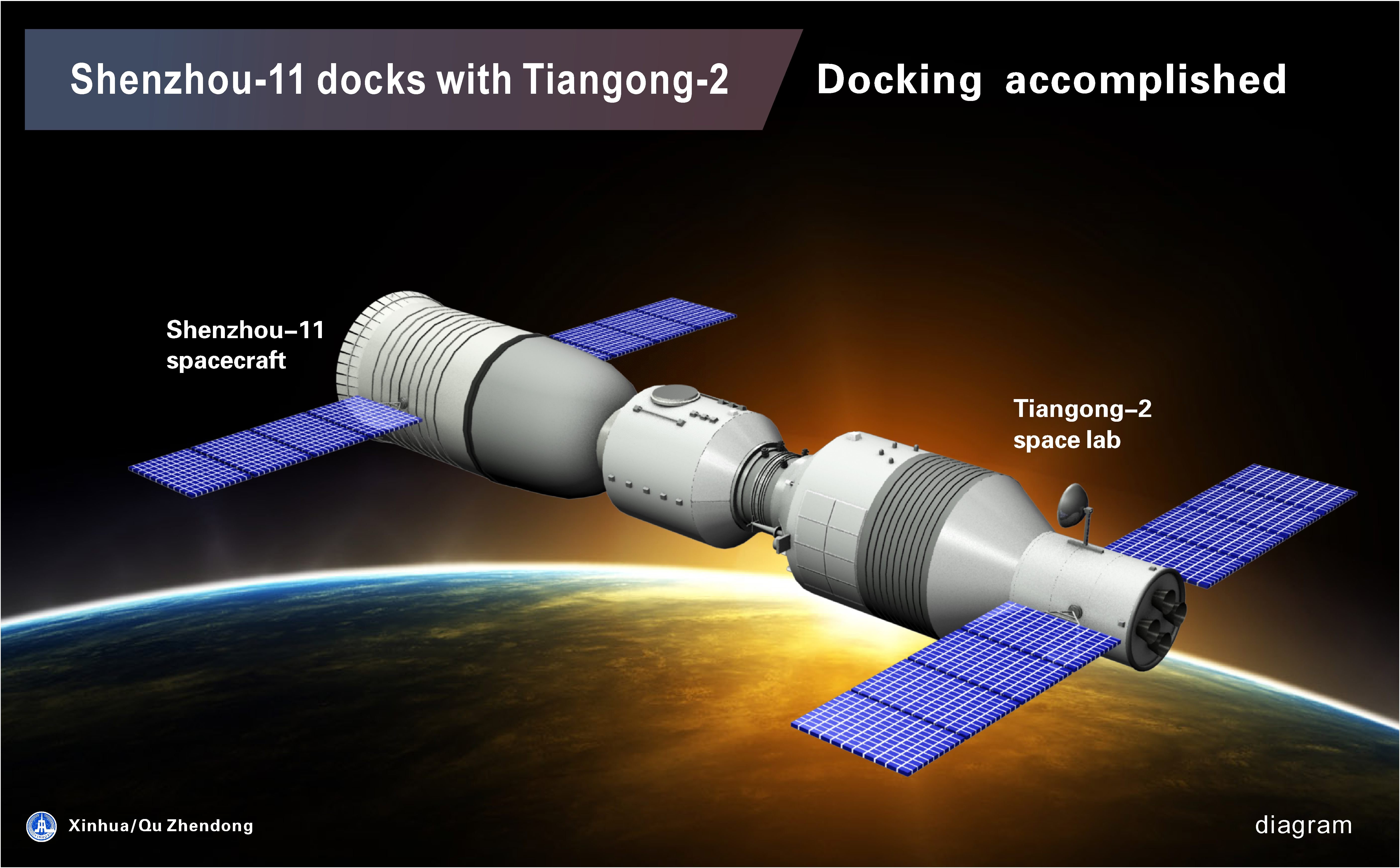 The diagram shows the procedure of Shenzhou-11 manned spacecraft automated docking with Tiangong-2 space lab on Oct. 19, 2016. (Xinhua/Qu Zhendong)