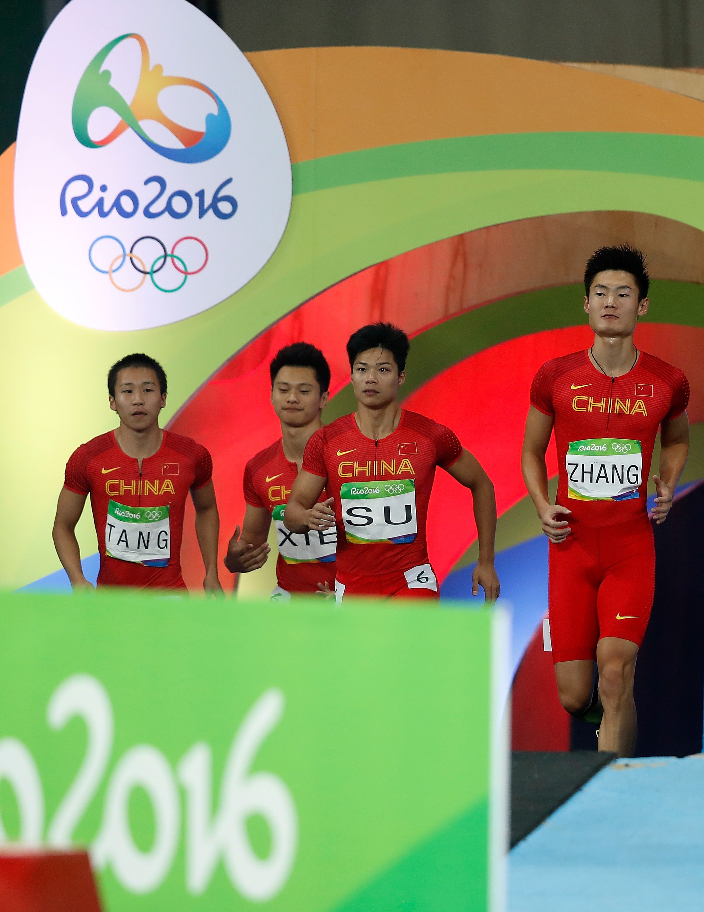 China's Tang Xingqiang, Xie Zhenye, Su Bingtian and Zhang Peimeng (L to R) are seen before the men's 4X100m relay final at the 2016 Rio Olympic Games in Rio de Janeiro, Brazil, on Aug. 19, 2016. (Xinhua/Wang Lili)