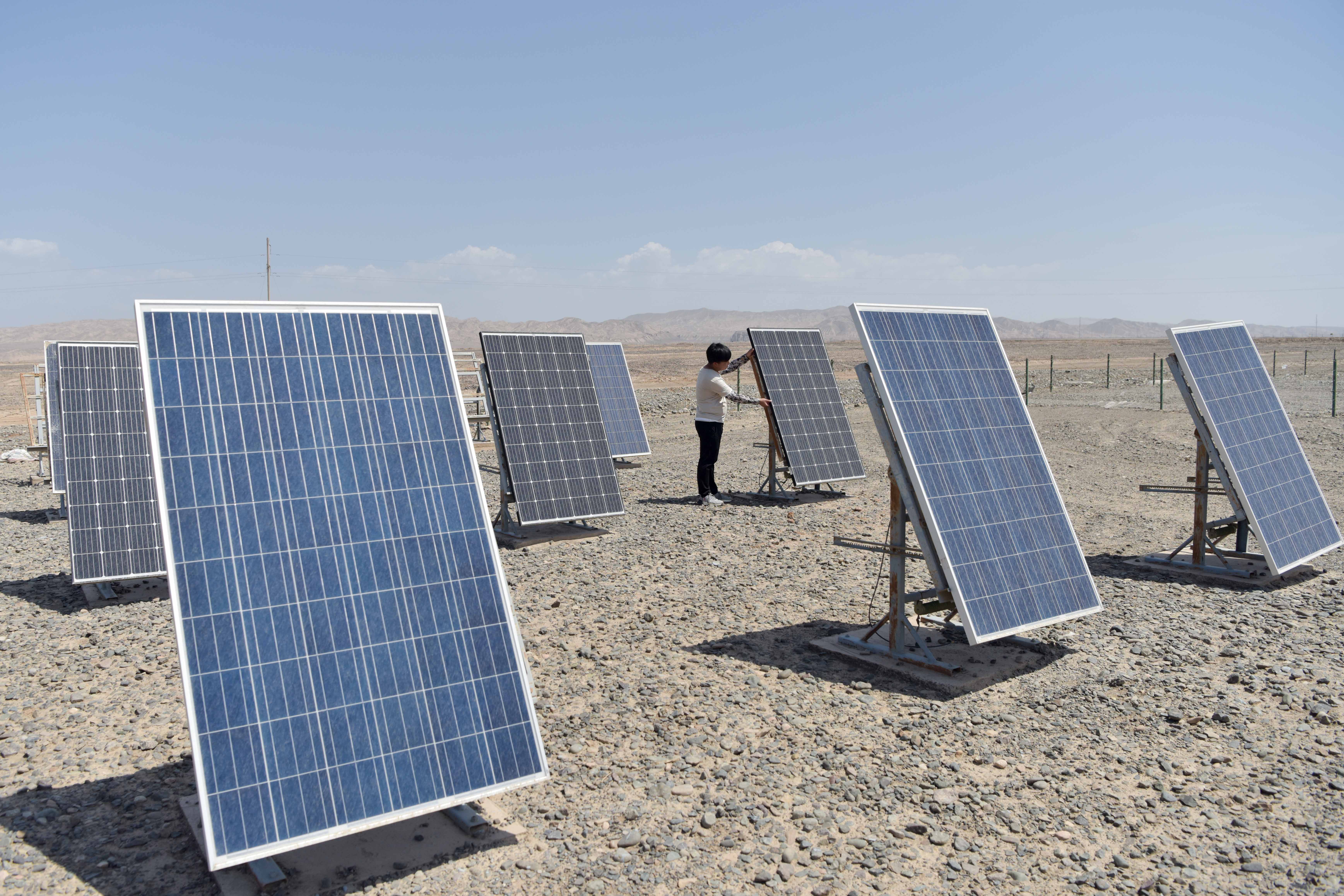 Inspector You Liwu adjusts the angle of photovoltaic panel at a photovoltaic dry-heat test area on a large patch of land of the Xinjiang Turpan Natural Environment Experimental Research Center in Turpan, northwest China's Xinjiang Uygur Autonomous Region, July 17, 2019. (Xinhua/Ding Lei)