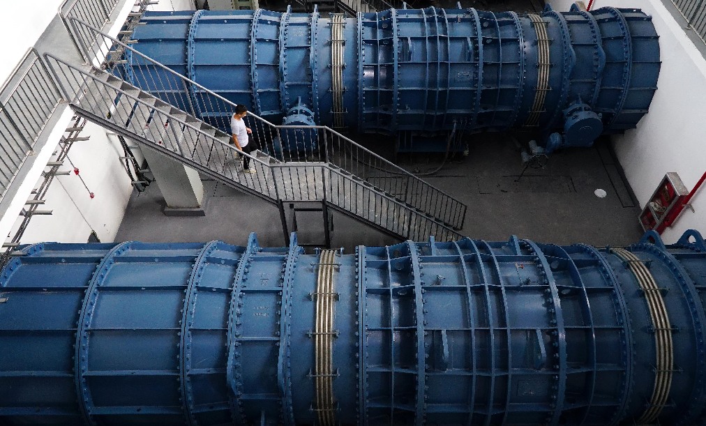 A worker conducts routine check on a pump station at E'hu Park in Pingxiang, east China's Jiangxi Province, May 28, 2019. (Xinhua/Peng Zhaozhi)