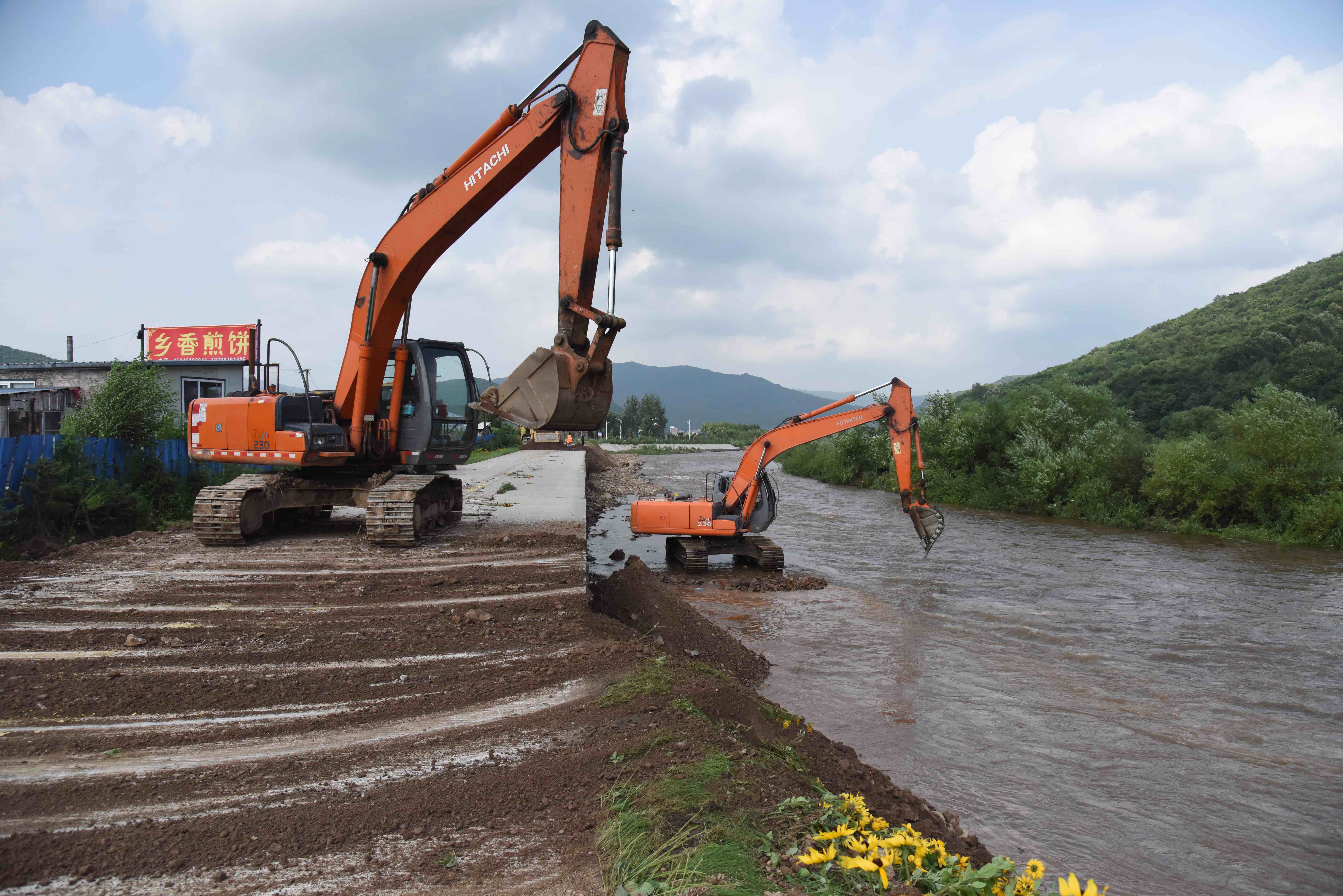 Photo taken on July 31 shows an embankment undergoing repairs in Yuanbao Village, Shangzhi city, Heilongjiang Province, northeast China. (Xinhua/Qiang Yong)