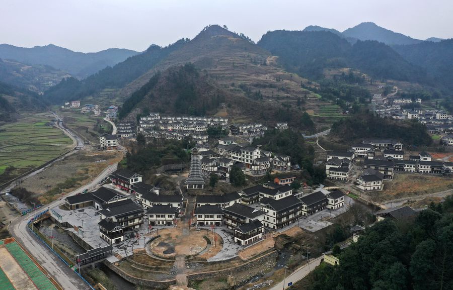 Aerial photo taken on Feb. 28, 2019 shows a poverty alleviation settlement in southwest China's Guizhou Province. (Xinhua/Yang Wenbin)