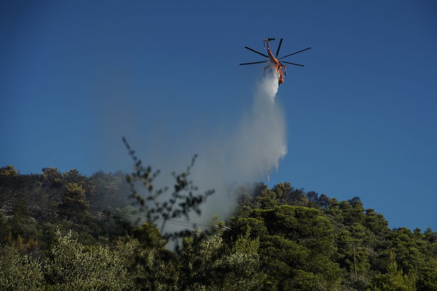 A fire brigade helicopter sprays water to extinguish a wildfire on Hymettus mountain in Athens, Greece, Aug. 12, 2019. (Photo by Nick Paleologos/Xinhua)