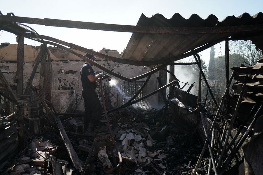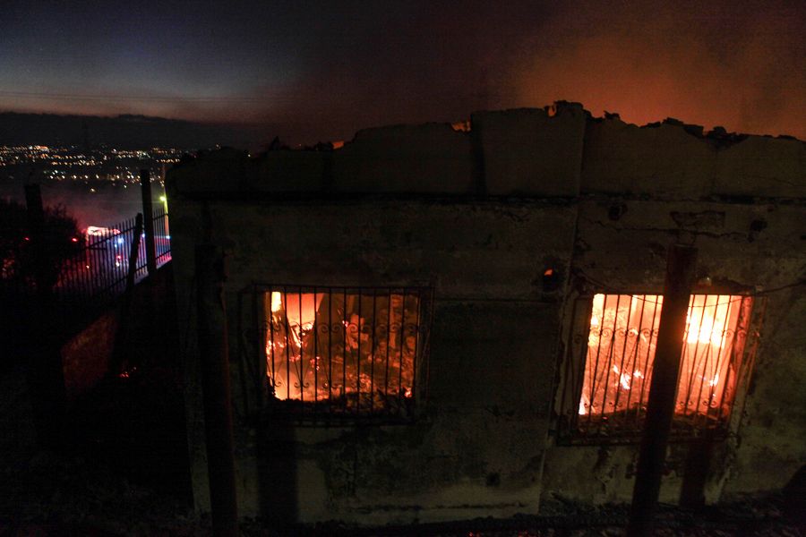 A burning house is seen during a wildfire on Hymettus mountain in Athens, Greece, Aug. 12, 2019. (Photo by Nick Paleologos/Xinhua)