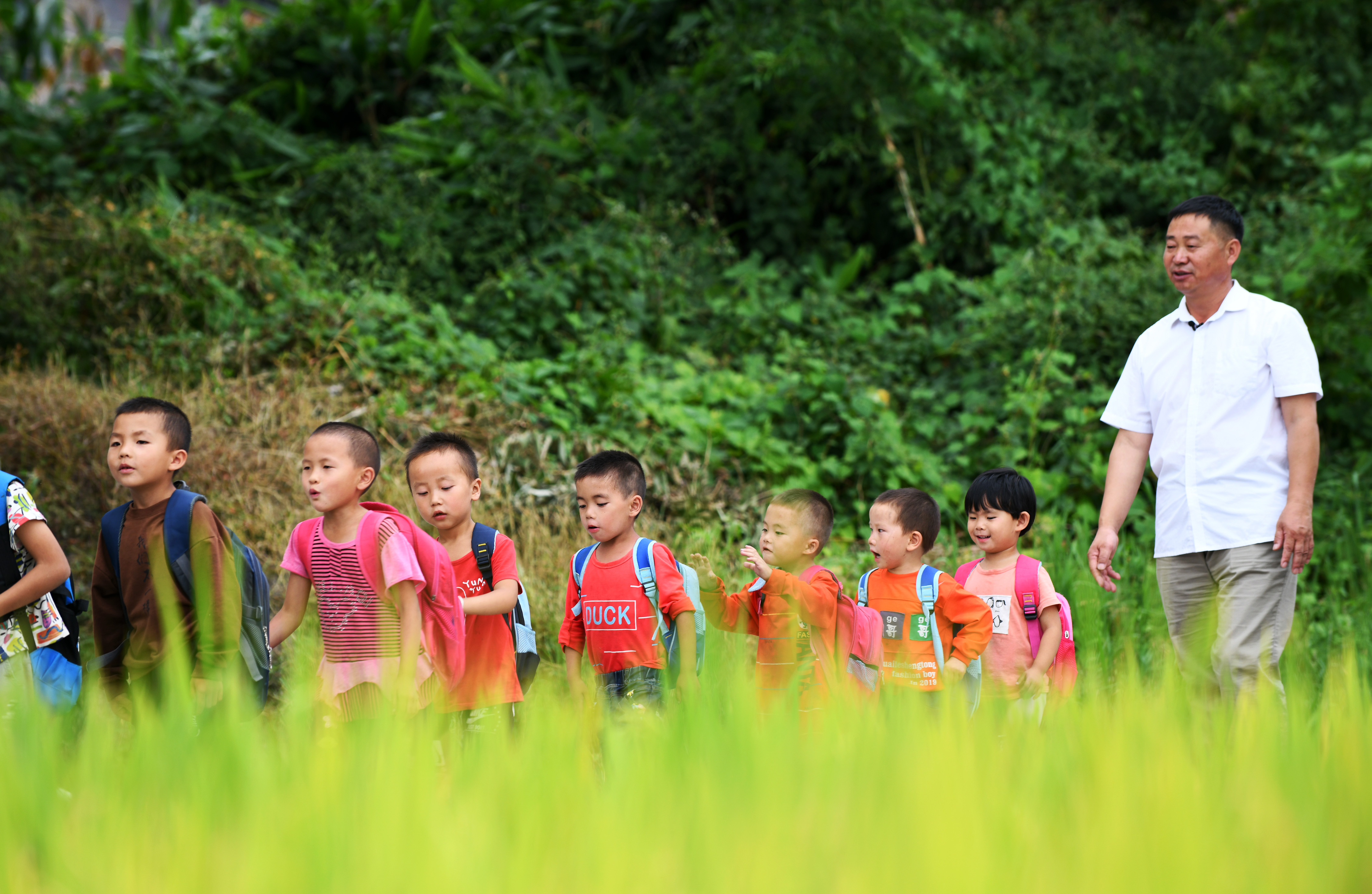 Students are escorted by Wu Guoxian to go home at Liuguang Village of Longli County in Bouyei-Miao Autonomous Prefecture of Qiannan, southwest China's Guizhou Province, Aug. 26, 2019.(Xinhua/Yang Wenbin)