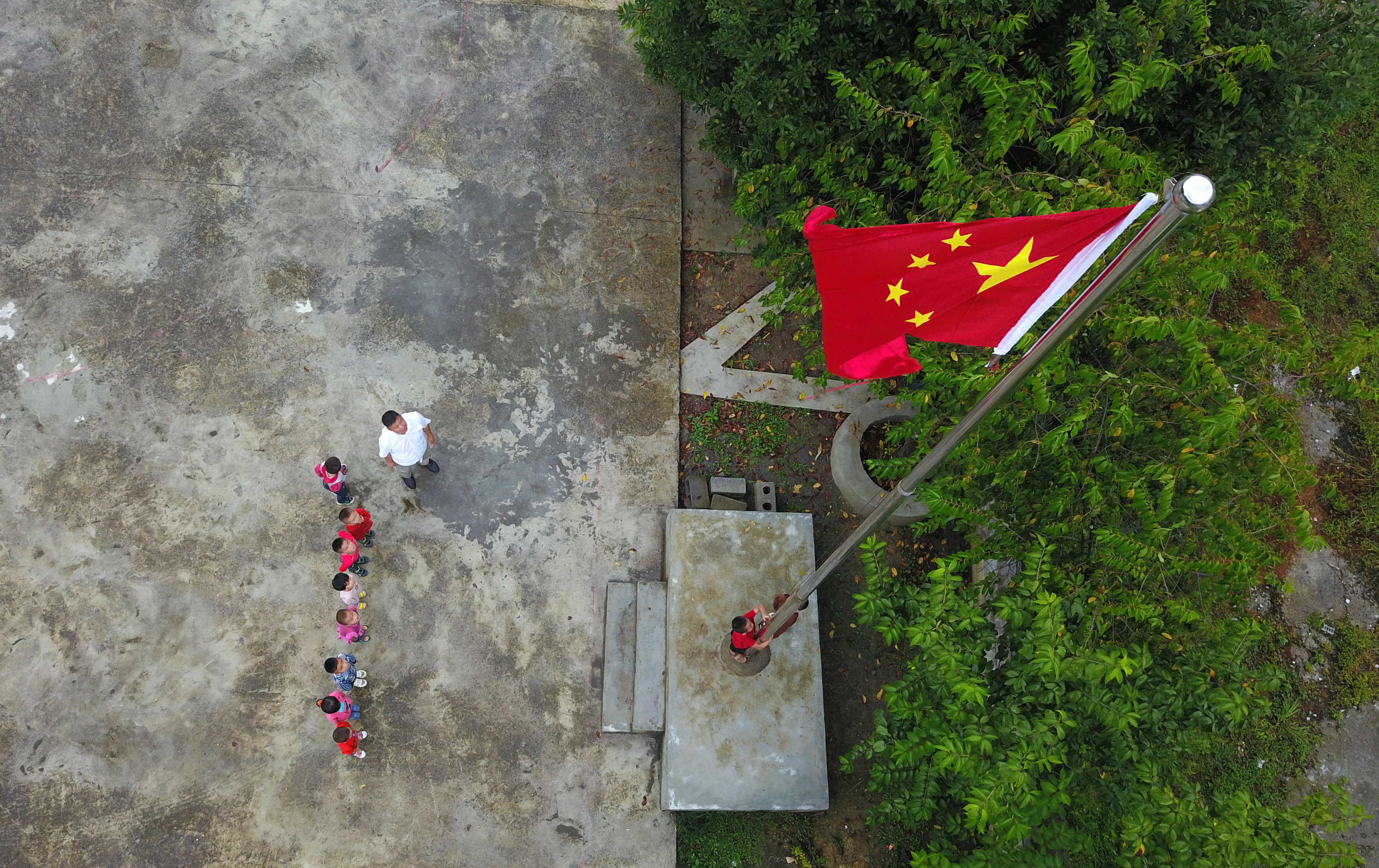 Aerial photo taken on Aug. 27, 2019 shows Wu Guoxian and students attending a flag-raising ceremony at Gugang Primary School in Liuguang Village of Longli County in Bouyei-Miao Autonomous Prefecture of Qiannan, southwest China's Guizhou Province. (Xinhua/Yang Wenbin)