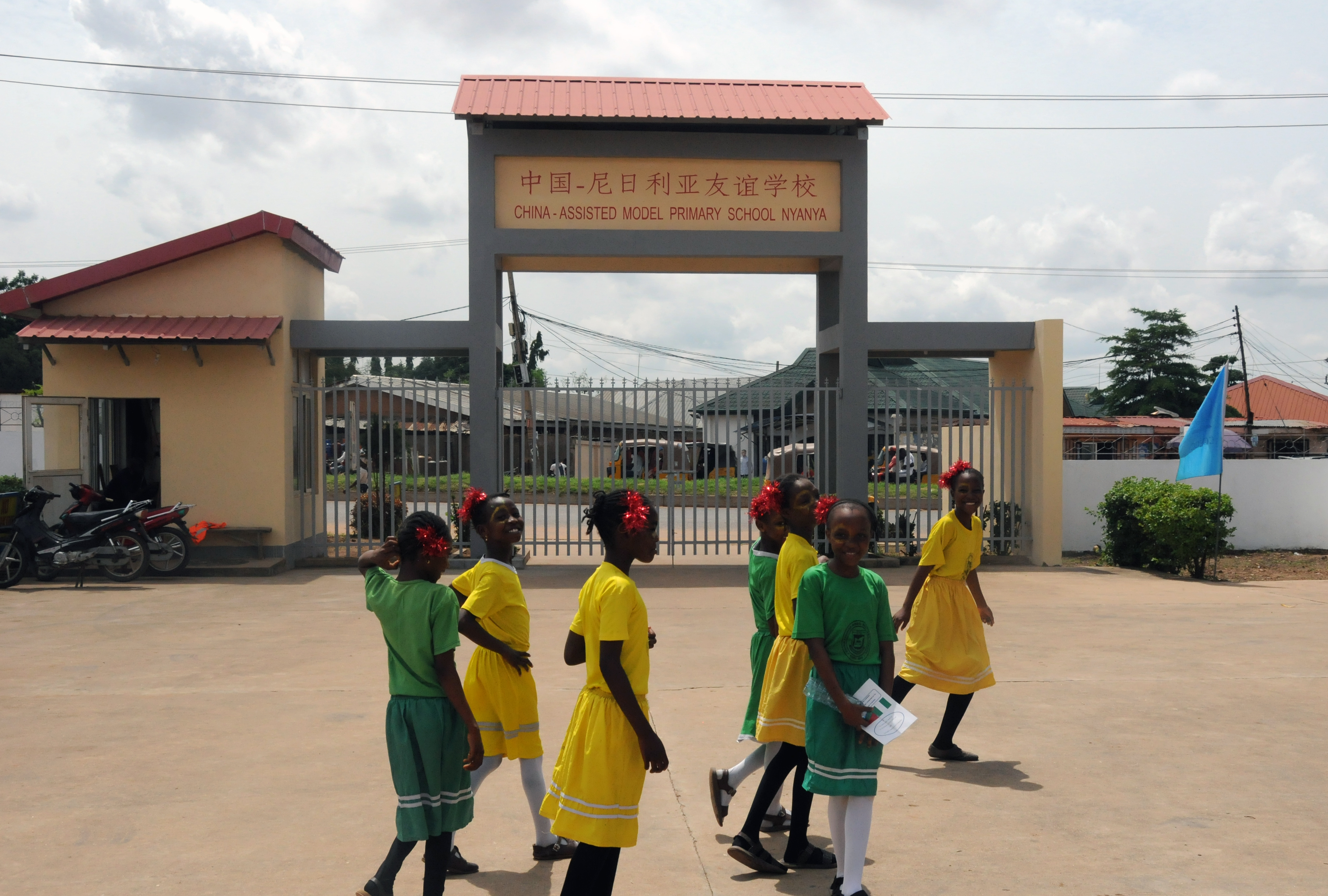 Students walk past the entrance to a China-assisted model primary school in Abuja, Nigeria, July 6, 2018. (Xinhua/Zhang Baoping)