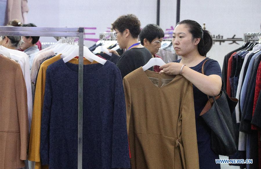 People view clothes displayed during the 30th China (Dalian) International Garment and Textile Fair in Dalian, northeast China's Liaoning Province, Sept. 7, 2019. The fair started in Dalian on Saturday. (Xinhua/Long Lei)