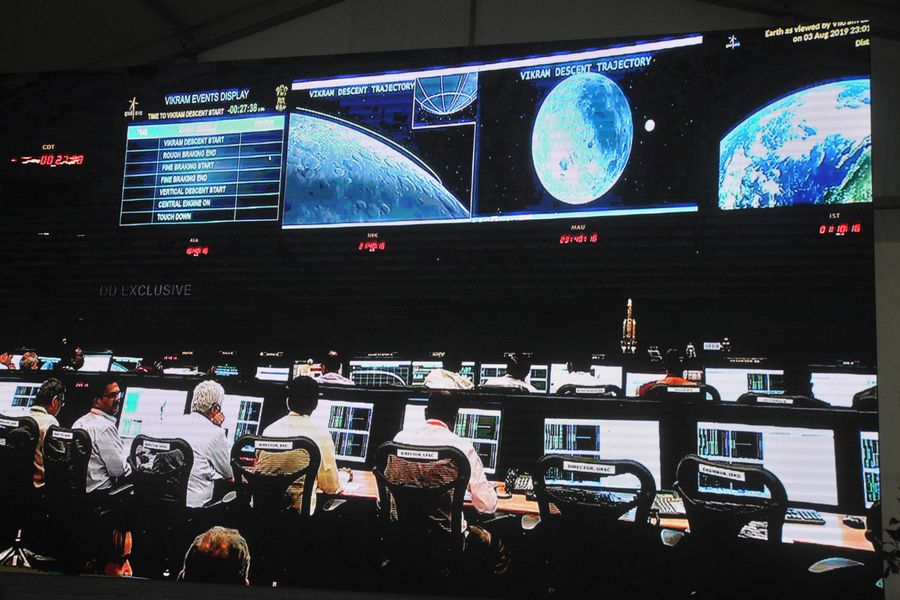 Staff work at a control room for the landing of Chandrayaan-2's Lander Vikram on the moon surface in Bangalore, India, Sept. 7, 2019. (Str/Xinhua)