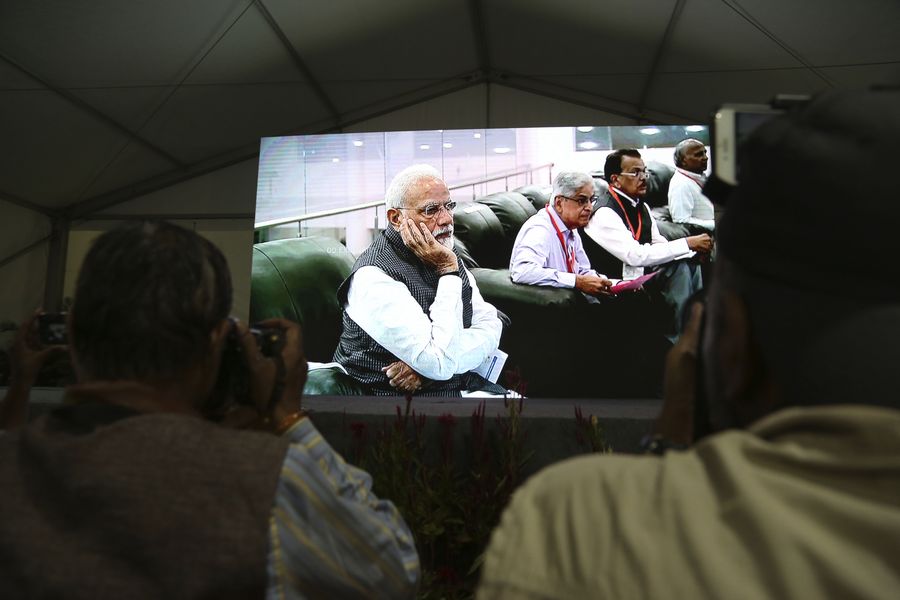 Indian PM Narendra Modi watches the live broadcast of the landing process of Chandrayaan-2's Lander Vikram on the moon surface in Bangalore, India, Sept. 7, 2019. (Str/Xinhua)