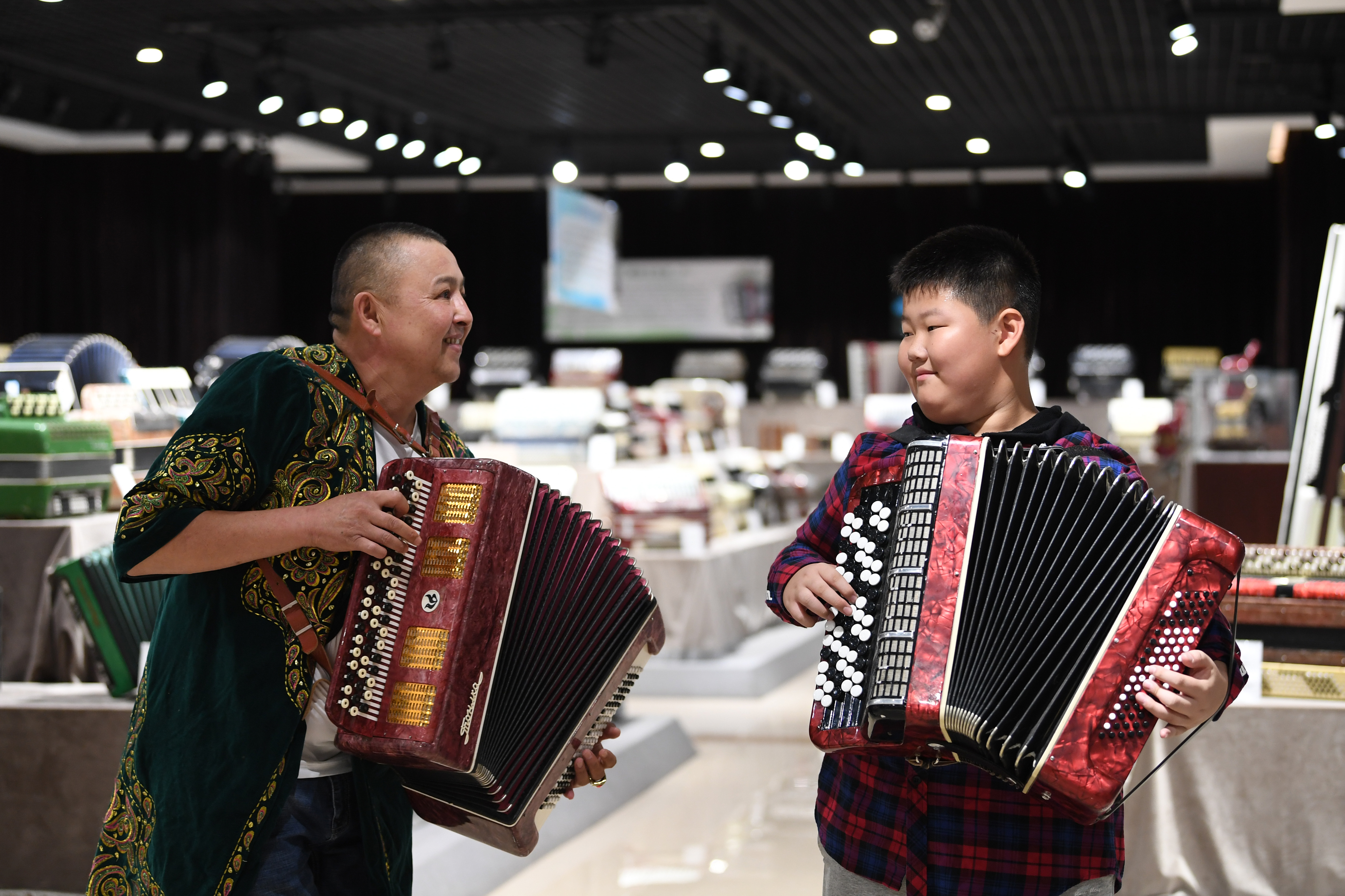 A staff and a pupil play the accordions at the Tacheng accordion museum, Sept. 4, 2019. (Xinhua/Sadat)