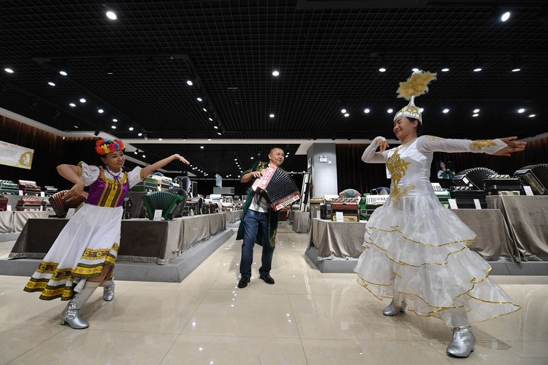 A staff plays the accordion with the dancing girls at the Tacheng accordion museum, Sept. 4, 2019. (Xinhua/Sadat)