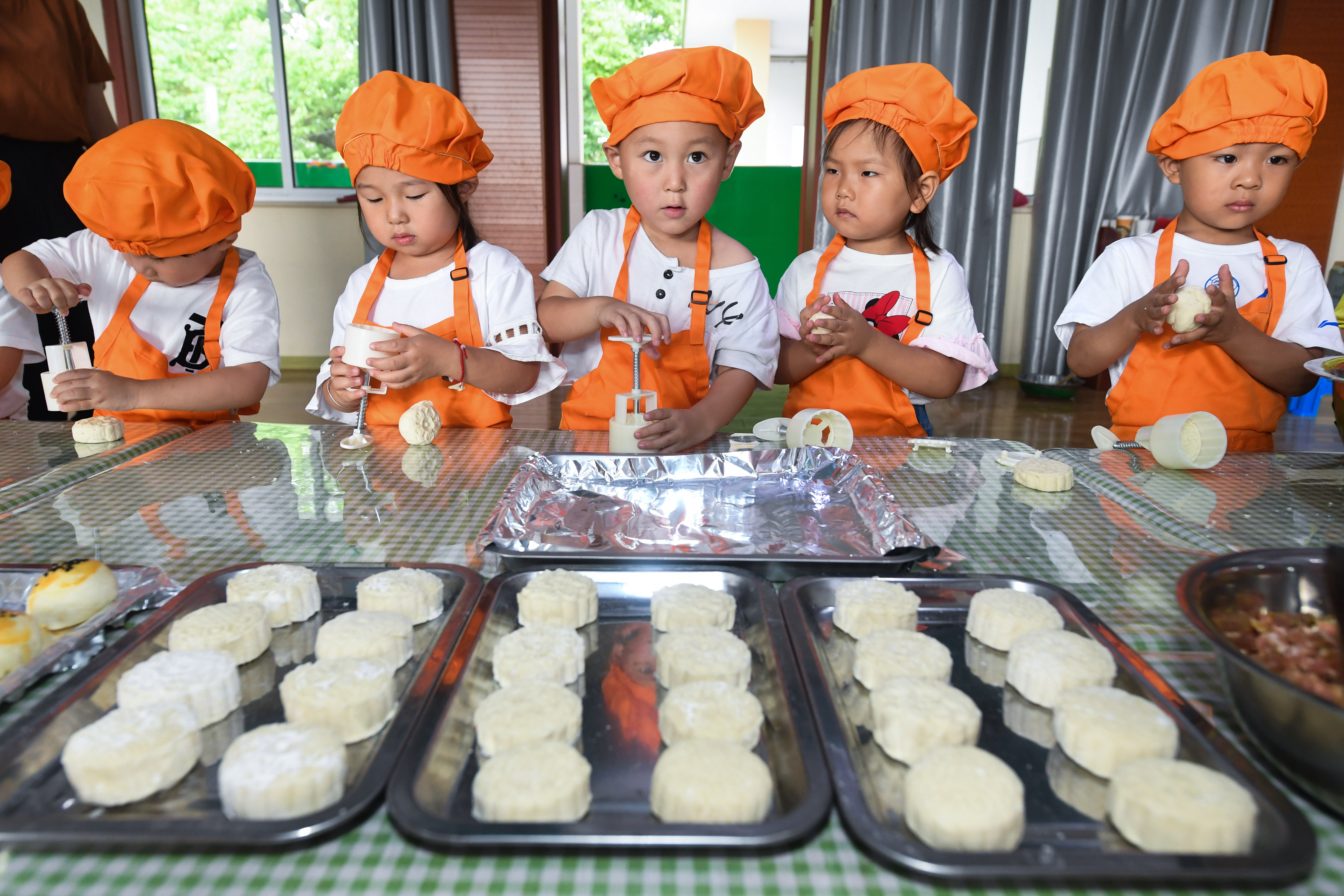 Children make mooncakes at a kindergarten in Changxing County, east China's Zhejiang Province, Sept. 11, 2019. (Xinhua/Xu Yu)