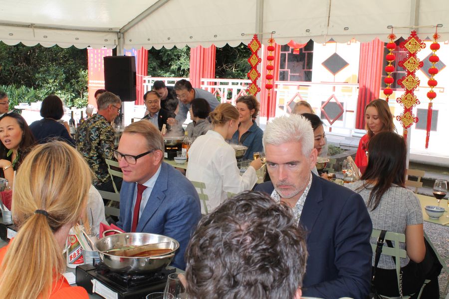 Invited guests take part in a feast of Chinese beverages and Chinese hot pot in front of the Chinese Pavillion in the Frederiksberg Gardens in Copenhagen, Denmark, Sept. 7, 2019. (Photo by David A. Williams/Xinhua)