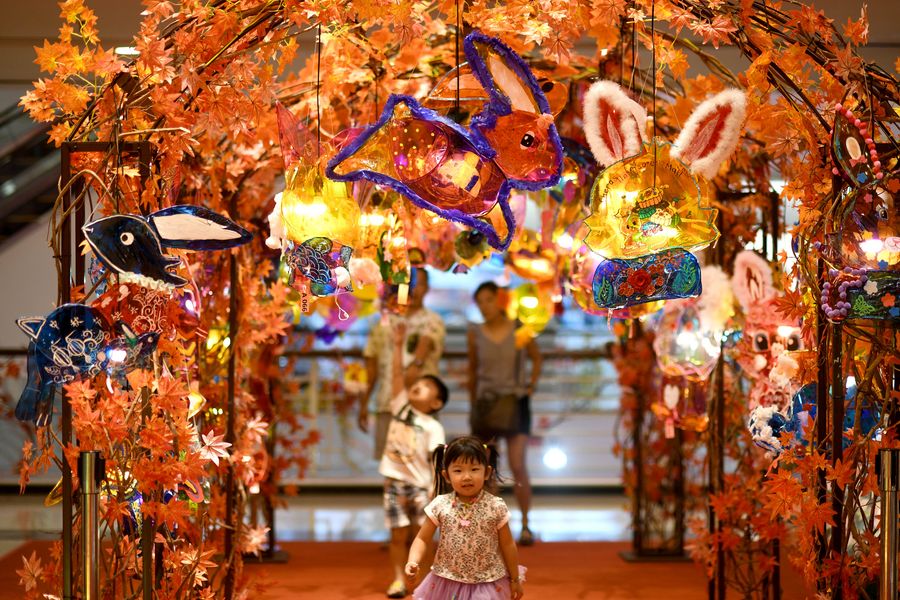 Customers walk in a mall decorated with lanterns which are used to celebrate the upcoming Chinese traditional Mid-Autumn Festival in Kuala Lumper, Malaysia, Step. 2, 2019. (Photo by Chong Voon Chung/Xinhua)
