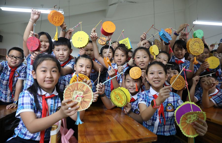 Students display handicraft works they made featuring Mid-Autumn Festival in Shijiazhuang Qiaoxi Foreign Language Primary School in Shijiazhuang, north China's Hebei Province, Sept. 12, 2019. (Xinhua/Luo Xuefeng)