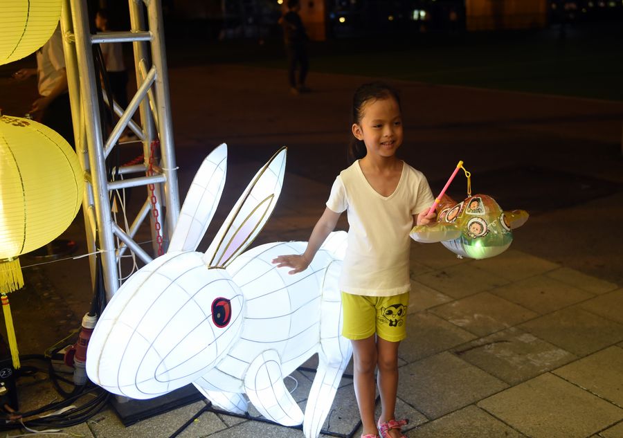 A child poses for photos beside a rabbit-shaped lantern during a lantern fair celebrating the Mid-Autumn Festival at Victoria Park in Hong Kong, south China, Sept. 11, 2019. (Xinhua/Lo Ping Fai)