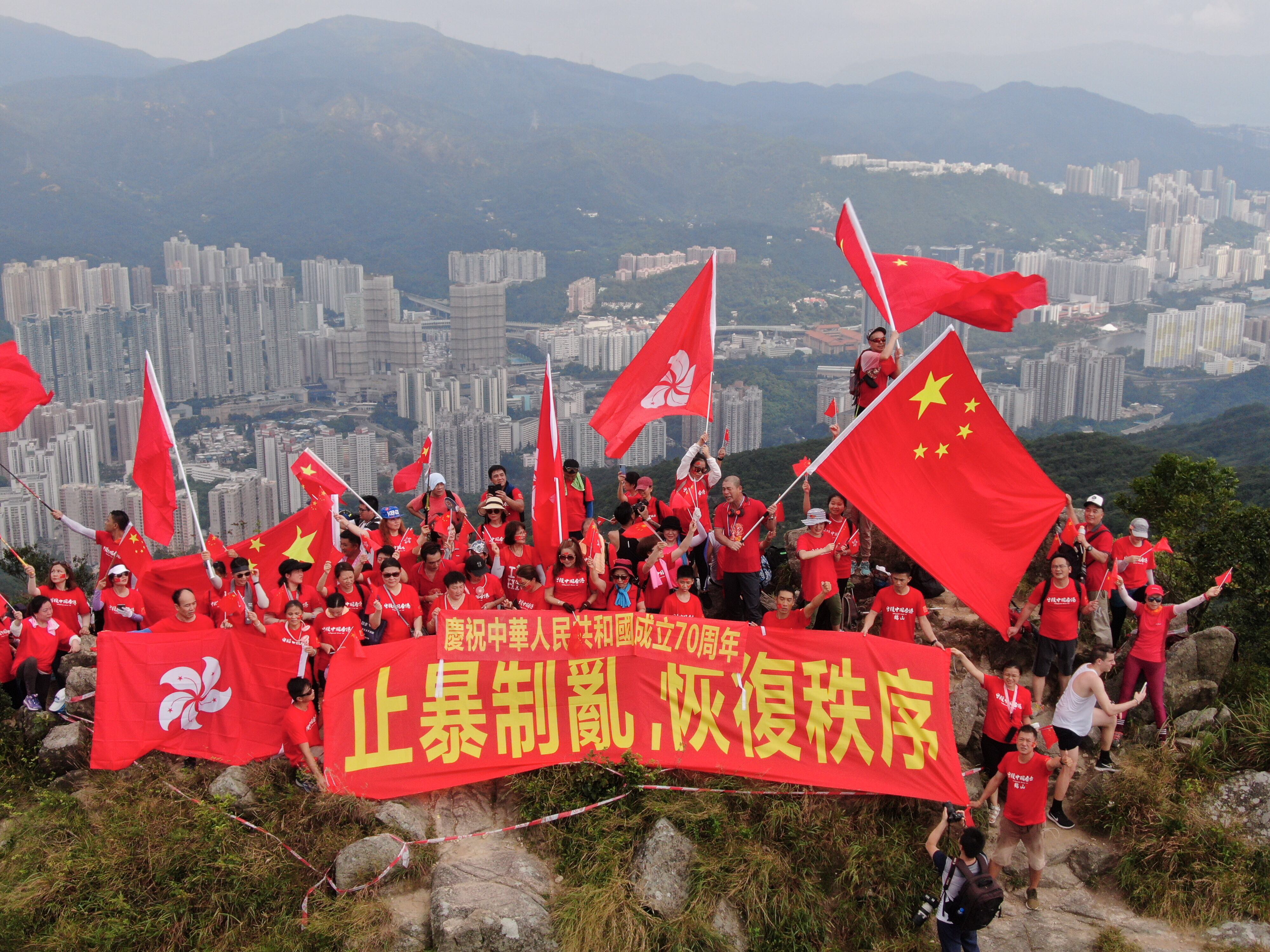 Residents wave China's national flag and the flag of the Hong Kong Special Administrative Region (SAR) at the peak of Lion Rock in Hong Kong, south China, Sept. 14, 2019. Over 100 Hong Kong residents waved the flags and held banners reading "Celebrating the 70th anniversary of the founding of the People's Republic of China" and "Stopping violence, ending the chaos and restoring order" here on Saturday. (Xinhua/Lui Siu Wai)