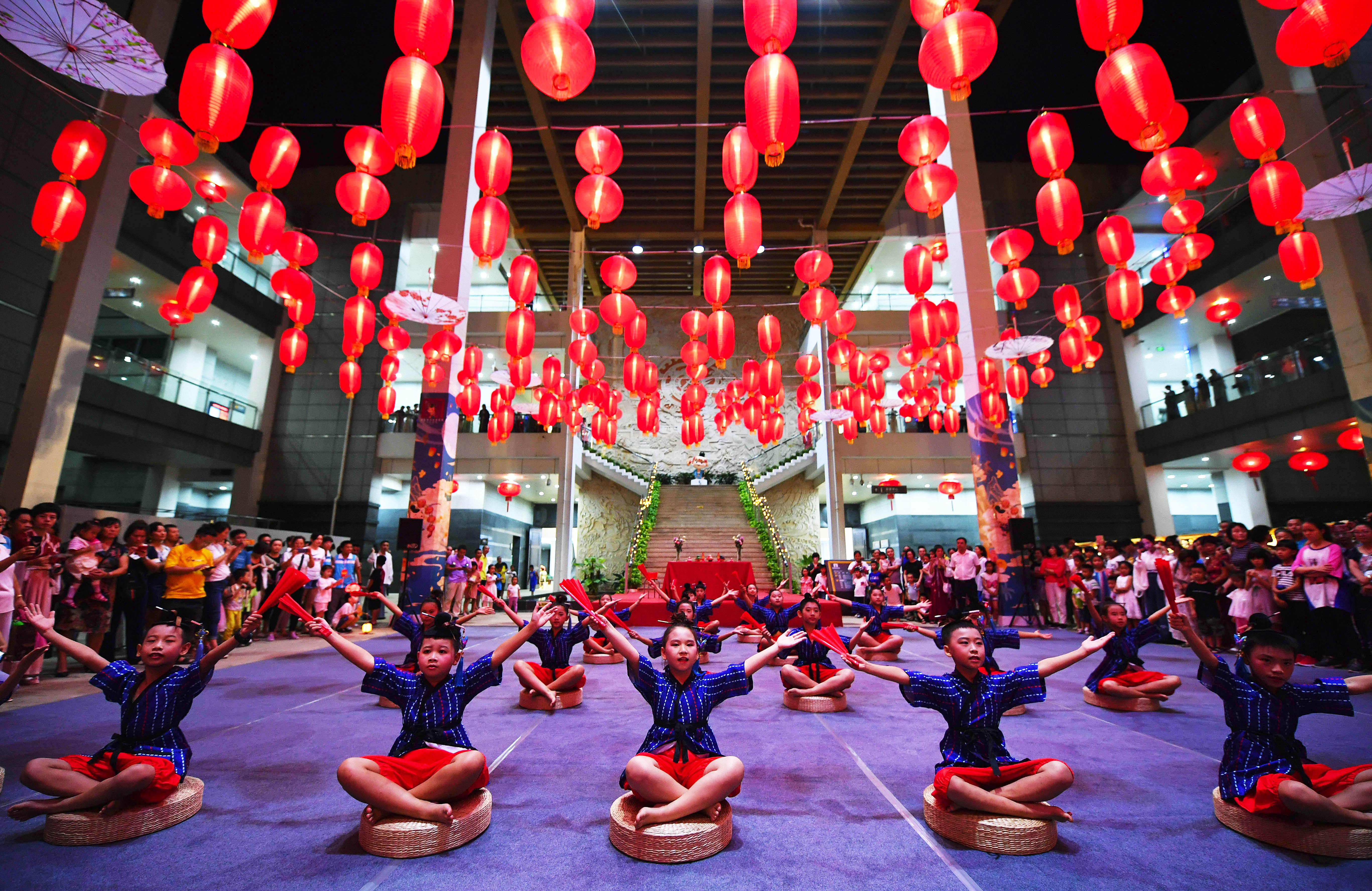 Children perform during an event held to celebrate the Mid-Autumn Festival in Hainan Museum in Haikou, capital of south China's Hainan Province, Sept. 13, 2019. Activities such as performance, exhibition of folk custom and moon cake making were provided in the event, attracting many visitors. (Xinhua/Guo Cheng)