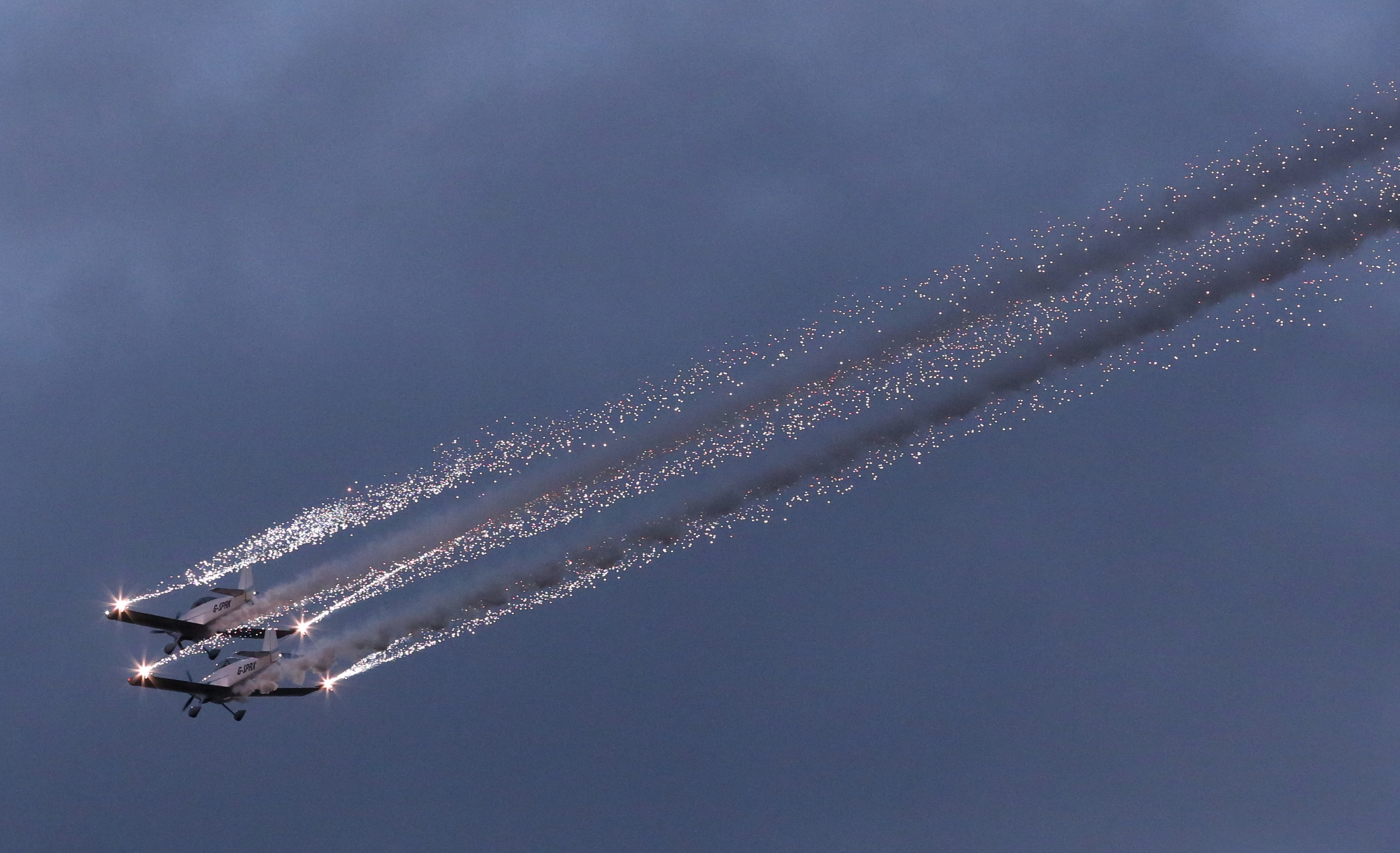 Fireflies Aerobatic Team from the United Kingdom flies at the Sanicole Sunset Airshow in Hechtel, Belgium, Sept. 13, 2019. (Xinhua/Wang Xiaojun)