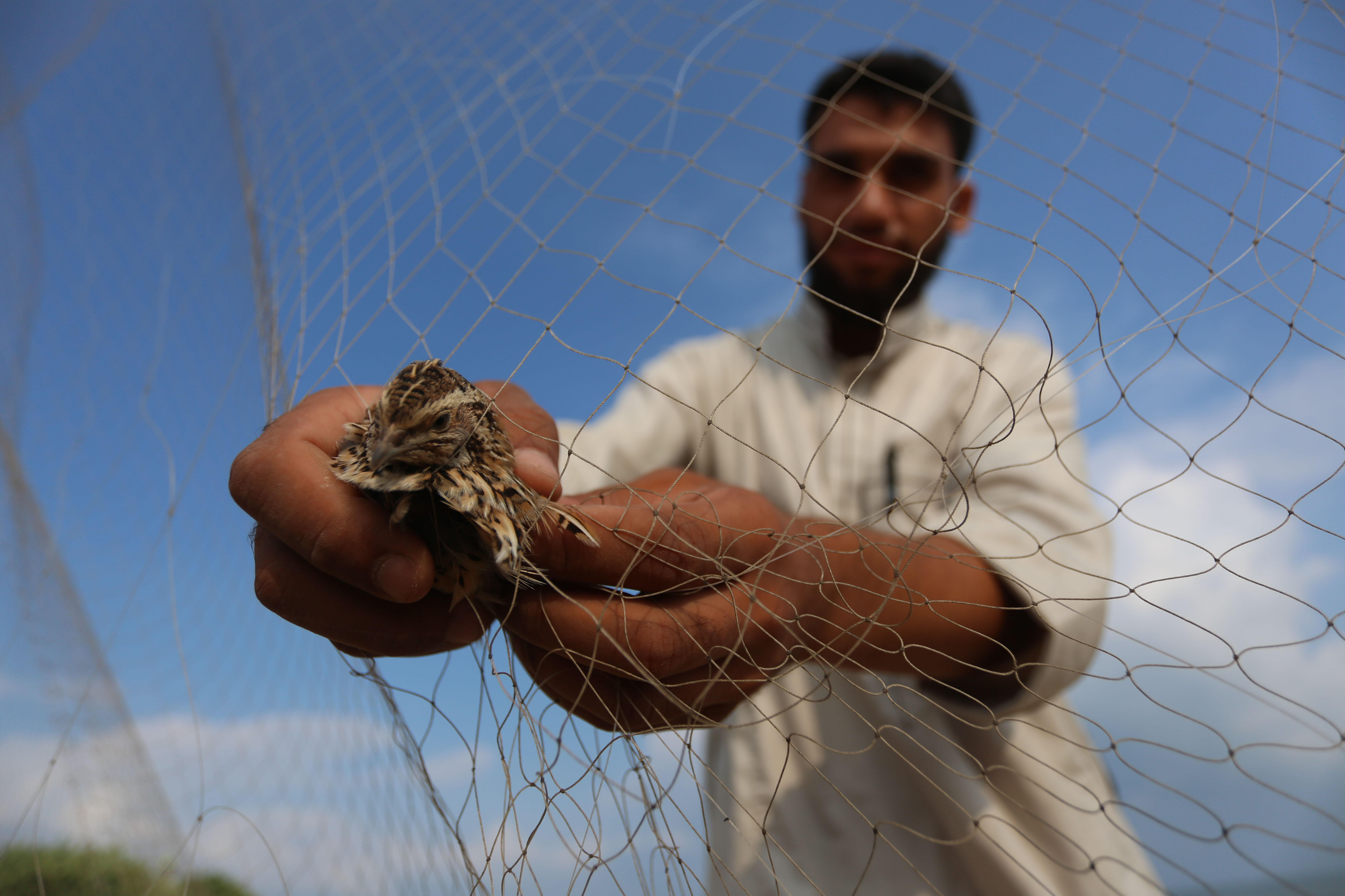 A Palestinian removes a migrant quail snared in a net on the beach in southern Gaza Strip city of Rafah on Sept. 14, 2019. (Photo by Khaled Omar/Xinhua)
