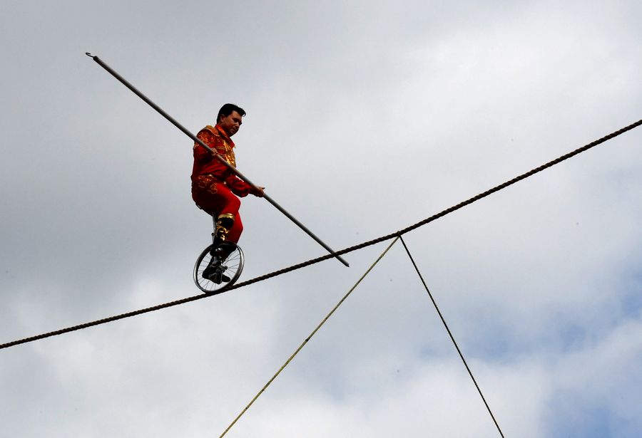 Cheered on by crowded spectators, high-wire walker Adili Wuxor performs the Uygur ethnic group's acrobatic feat known as Dawaz with his pupils on a tightrope high above the ground.