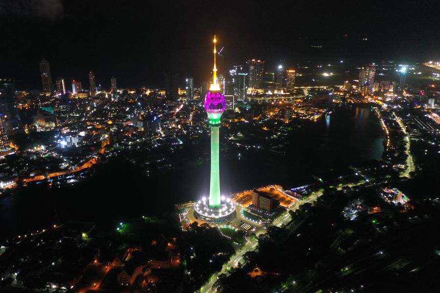 Photo taken on Sept. 16, 2019 shows the Lotus Tower and its light show in Colombo, Sri Lanka. (Xinhua/Tang Lu)