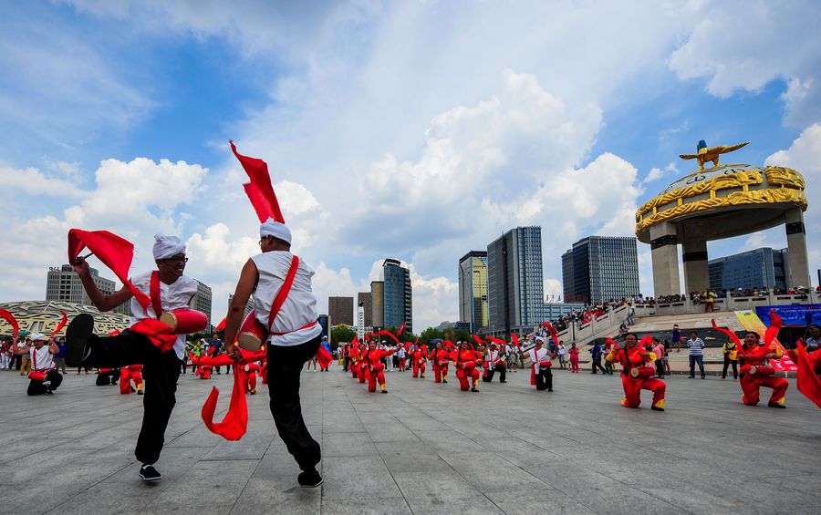 Citizens perform waist drum dance as the seventh National Fitness Day approaches in Ordos, north China's Inner Mongolia Autonomous Region, on Aug. 8, 2015. (Xinhua/Lian Zhen)