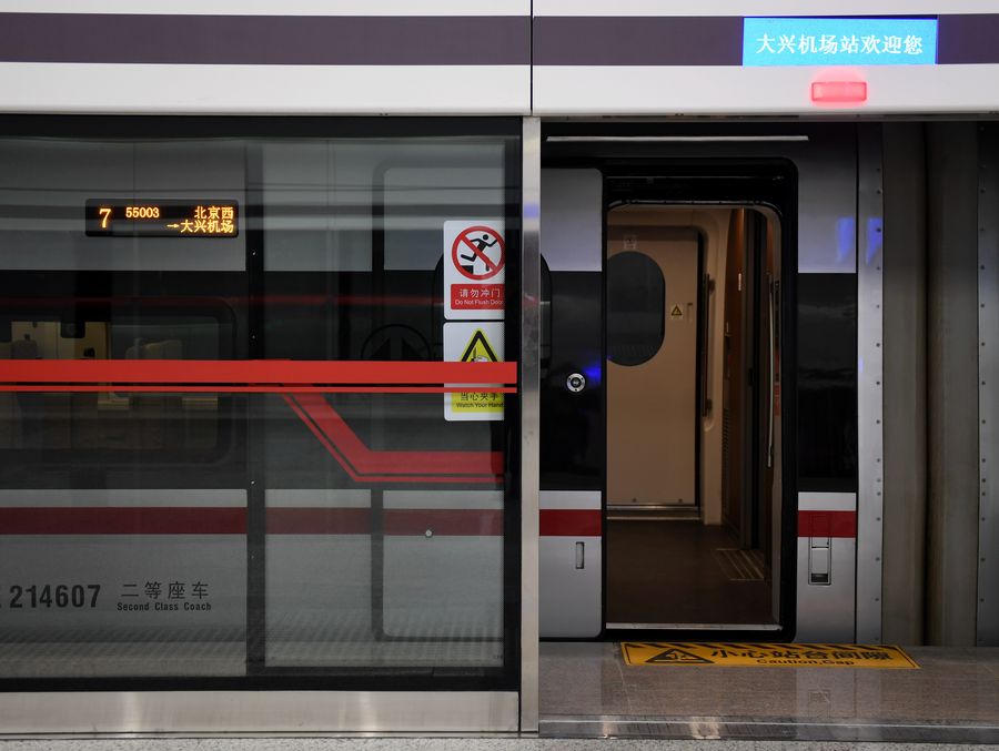 A Fuxing (Rejuvenation) bullet train pulls in the Daxing Airport Railway Station of the Beijing-Xiongan intercity railway during a test run in Beijing, capital of China, Sept. 20, 2019. (Xinhua/Zhang Chenlin)