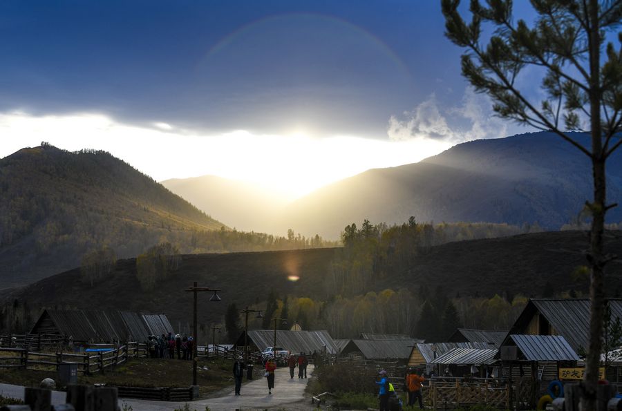 Tourists enjoy the scenery at dusk at Kanas scenic spot in northwest China's Xinjiang Uygur Autonomous Region, Sept. 26, 2019. (Xinhua/Wang Fei)